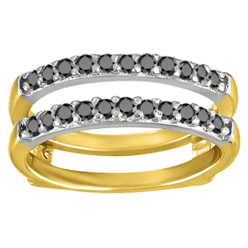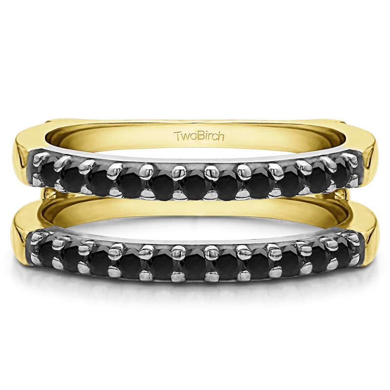 This wedding ring guard has 22 round, prong set stones. Each band measures 2.6 millimeters wide. This ring guard has 0.51 carats total weight. It is made to fit a round solitaire from 0.5 carats to 0.75, or a princess cut solitaire from 0.25 up to 0.5 carats.