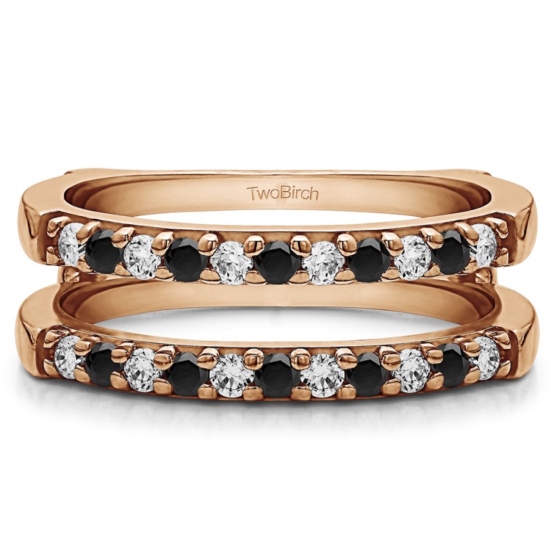 This wedding ring guard has 22 round, prong set stones. Each band measures 2.6 millimeters wide. This ring guard has 0.51 carats total weight. It is made to fit a round solitaire from 0.5 carats to 0.75, or a princess cut solitaire from 0.25 up to 0.5 carats.