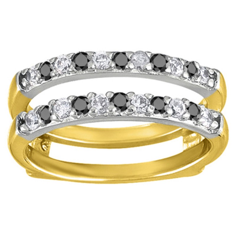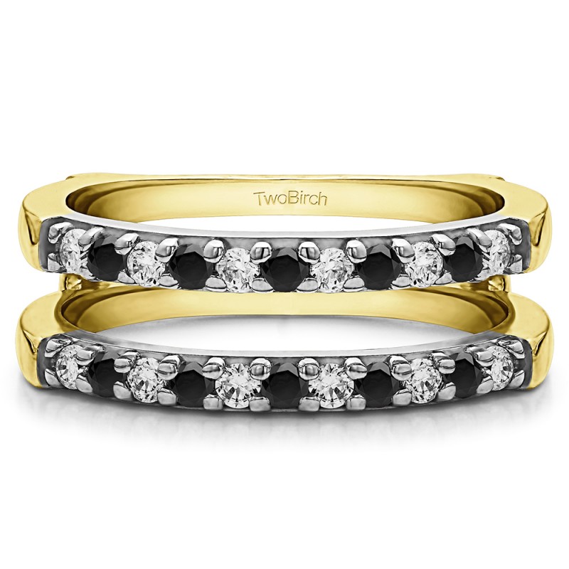 This wedding ring guard has 22 round, prong set stones. Each band measures 2.6 millimeters wide. This ring guard has 0.51 carats total weight. It is made to fit a round solitaire from 0.5 carats to 0.75, or a princess cut solitaire from 0.25 up to 0.5 carats.