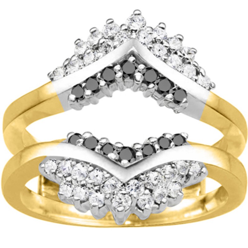 This wedding ring guard has 50 round, prong set stones. Each band measures 2 millimeters wide. This ring guard has 0.52 carats total weight. It is made to fit a round or princess cut solitaire from 0.25 carats to 2 carats.