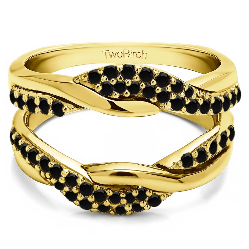 This wedding ring guard has 48 round, prong set stones. Each band measures 2.71 millimeters wide. This ring guard has 0.54 carats total weight. It is made to fit a round or princess cut solitaire from 0.5 carats to 2, or a marquise solitaire from 0.75 up to 1.5 carats.