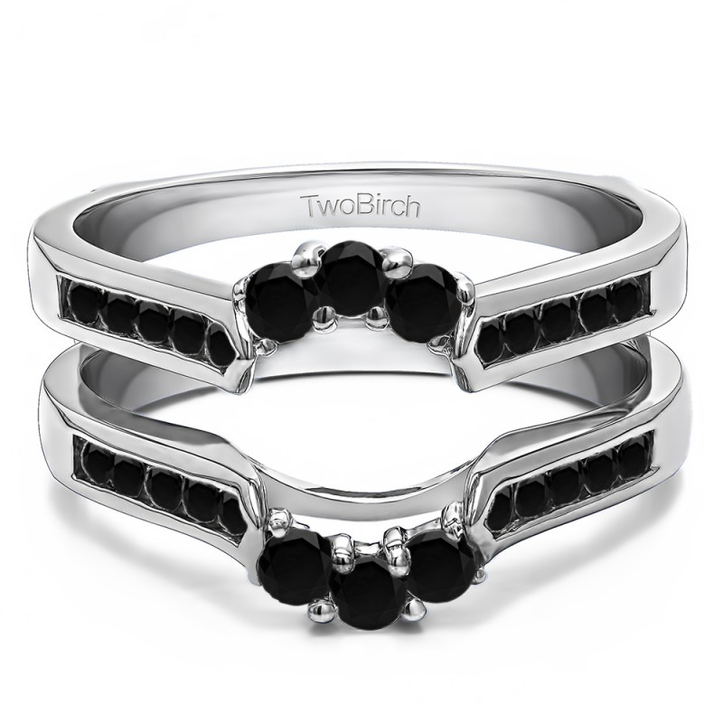 This wedding ring guard has 26 round, channel set stones. Each band measures 2 millimeters wide. This ring guard has 0.54 carats total weight. It is made to fit a round solitaire from 1 carats to 2 carats.