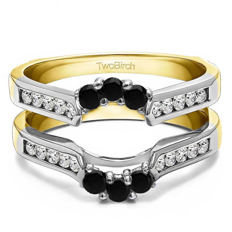 This wedding ring guard has 26 round, channel set stones. Each band measures 2 millimeters wide. This ring guard has 0.54 carats total weight. It is made to fit a round solitaire from 1 carats to 2 carats.