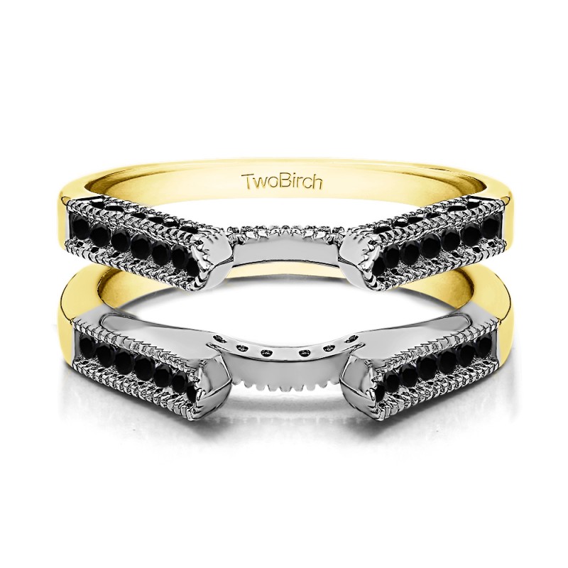This wedding ring guard has 64 round, channel set stones. Each band measures 2 millimeters wide. This ring guard has 0.54 carats total weight.