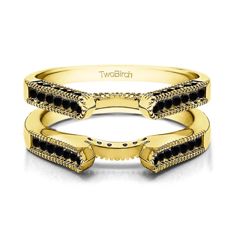 This wedding ring guard has 64 round, channel set stones. Each band measures 2 millimeters wide. This ring guard has 0.54 carats total weight.