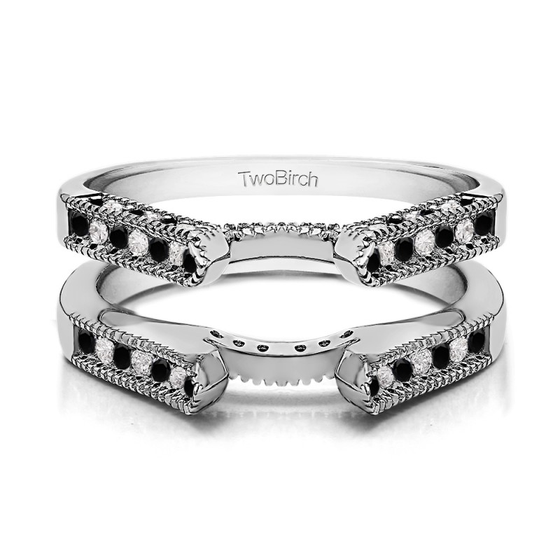 This wedding ring guard has 64 round, channel set stones. Each band measures 2 millimeters wide. This ring guard has 0.54 carats total weight.