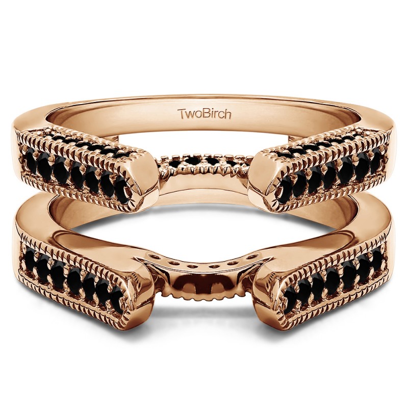 This wedding ring guard has 68 round, channel set stones. Each band measures 2 millimeters wide. This ring guard has 0.55 carats total weight. It is made to fit a round solitaire from 0.75 carats to 2, or a princess cut solitaire from 0.5 up to 2, or a marquise solitaire from 0.5 up to 1 carats.