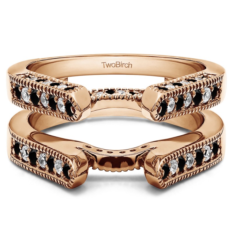 This wedding ring guard has 68 round, channel set stones. Each band measures 2 millimeters wide. This ring guard has 0.55 carats total weight. It is made to fit a round solitaire from 0.75 carats to 2, or a princess cut solitaire from 0.5 up to 2, or a marquise solitaire from 0.5 up to 1 carats.