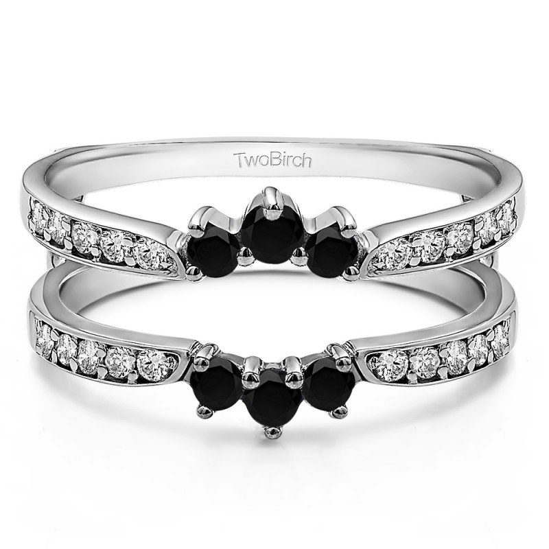This wedding ring guard has 26 round, prong set stones. Each band measures 2.1 millimeters wide. This ring guard has 0.56 carats total weight. It is made to fit a round solitaire from 0.25 carats to 1.75, or a princess cut solitaire from 0.25 up to 2, or a marquise solitaire from 0.25 up to 0.5 carats.