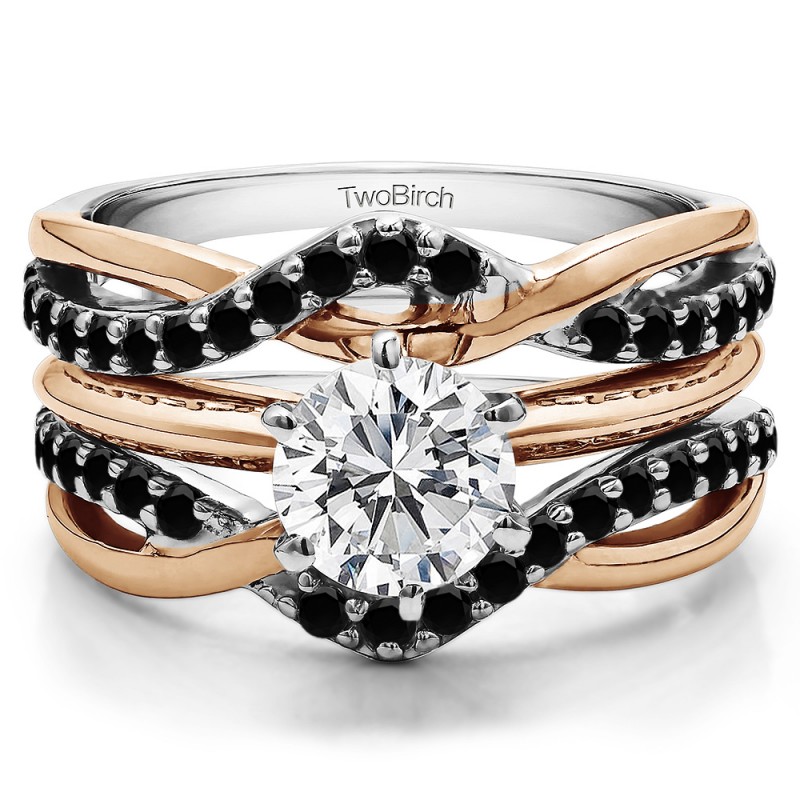This wedding ring guard has 38 round, prong set stones. Each band measures 2.2 millimeters wide. This ring guard has 0.57 carats total weight. It is made to fit a round or princess solitaire from 1 carats to 1.5, or a princess cut solitaire from 0.75 up to 2 carats.