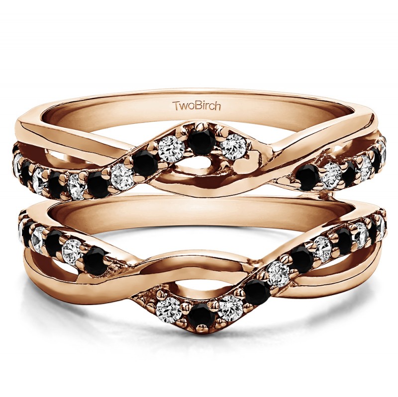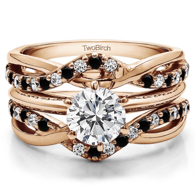 This wedding ring guard has 38 round, prong set stones. Each band measures 2.2 millimeters wide. This ring guard has 0.57 carats total weight. It is made to fit a round or princess solitaire from 1 carats to 1.5, or a princess cut solitaire from 0.75 up to 2 carats.