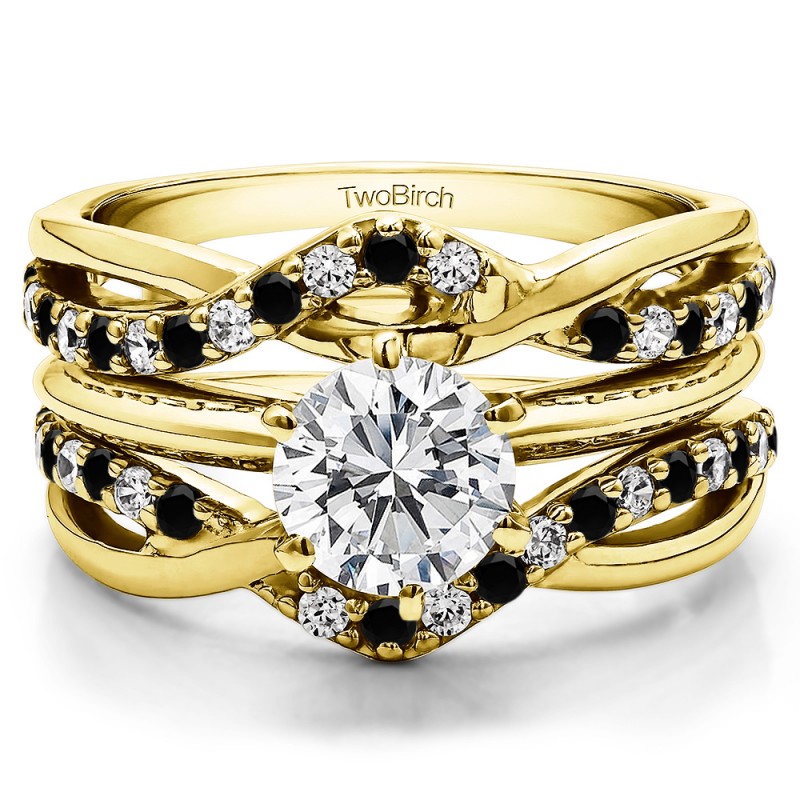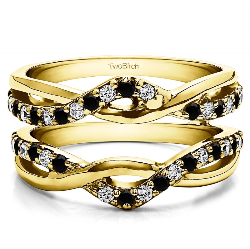 This wedding ring guard has 38 round, prong set stones. Each band measures 2.2 millimeters wide. This ring guard has 0.57 carats total weight. It is made to fit a round or princess solitaire from 1 carats to 1.5, or a princess cut solitaire from 0.75 up to 2 carats.