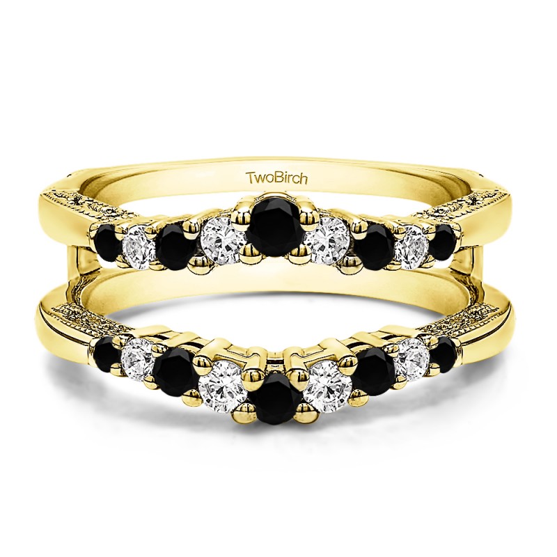 This wedding ring guard has 18 round, prong set stones. Each band measures 2.4 millimeters wide. This ring guard has 0.71 carats total weight. It is made to fit a round solitaire from 0.5 carats to 1 carats.