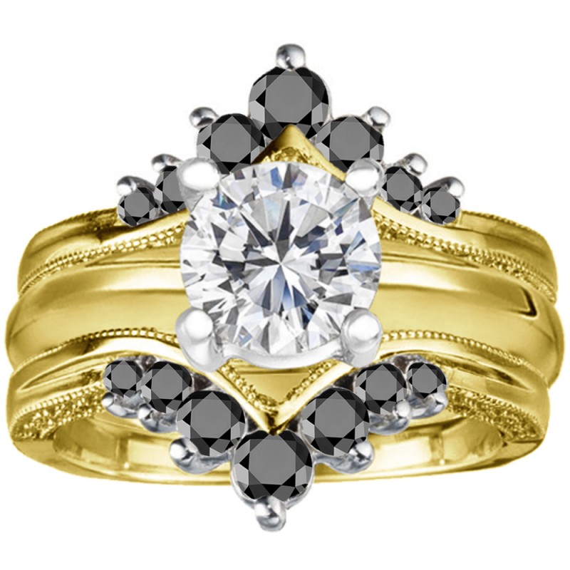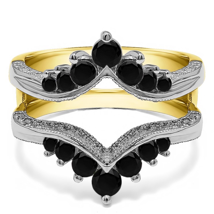 This wedding ring guard has 14 round, prong set stones. Each band measures 2.5 millimeters wide. This ring guard has 0.74 carats total weight. It is made to fit a round or princess cut solitaire from 0.5 carats to 2 carats.