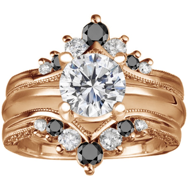 This wedding ring guard has 14 round, prong set stones. Each band measures 2.5 millimeters wide. This ring guard has 0.74 carats total weight. It is made to fit a round or princess cut solitaire from 0.5 carats to 2 carats.