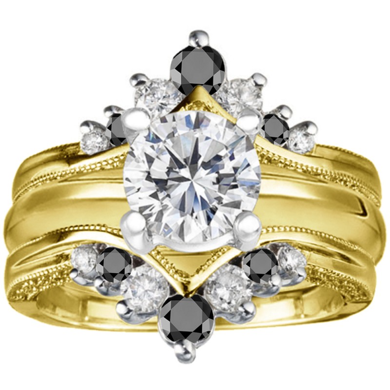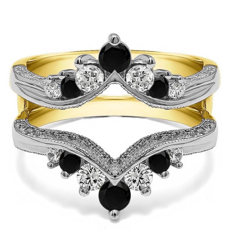 This wedding ring guard has 14 round, prong set stones. Each band measures 2.5 millimeters wide. This ring guard has 0.74 carats total weight. It is made to fit a round or princess cut solitaire from 0.5 carats to 2 carats.