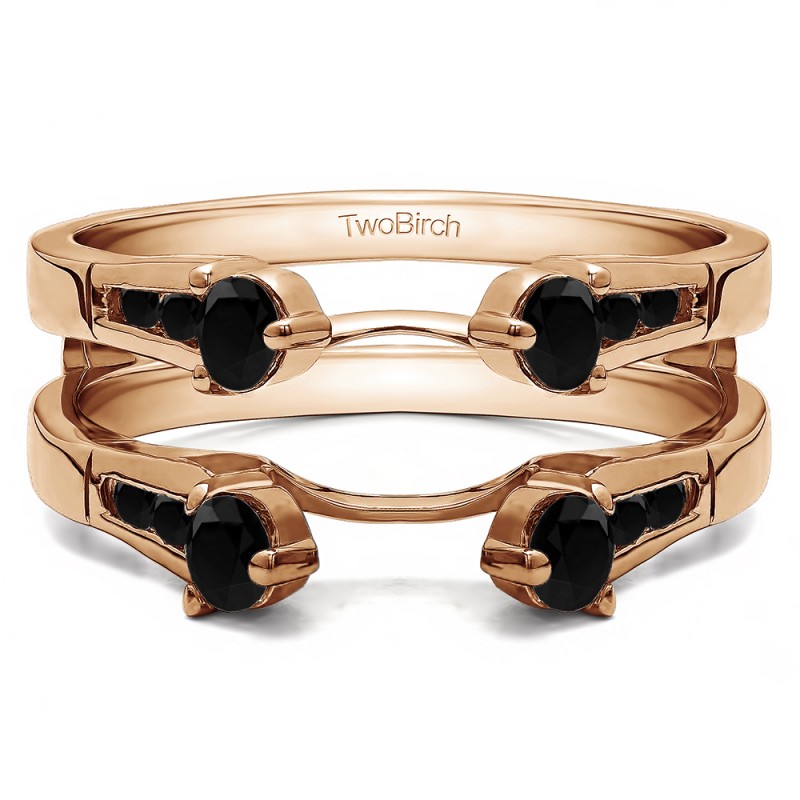 This wedding ring guard has 16 round, bar set stones. Each band measures 2 millimeters wide. This ring guard has 0.75 carats total weight. It is made to fit a round, marquise, or princess cut solitaire from 0.75 carats to 2 carats.
