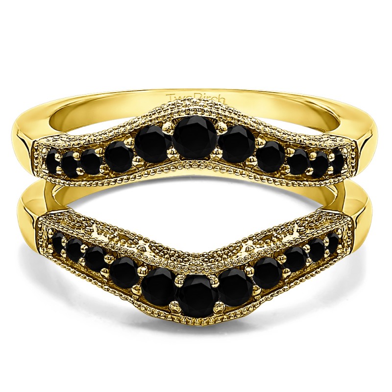 This wedding ring guard has 22 round, channel set stones. Each band measures 2 millimeters wide. This ring guard has 0.75 carats total weight. It is made to fit a round solitaire from 0.5 carats to 2, or a princess or marquise cut solitaire from 0.75 up to 2 carats.