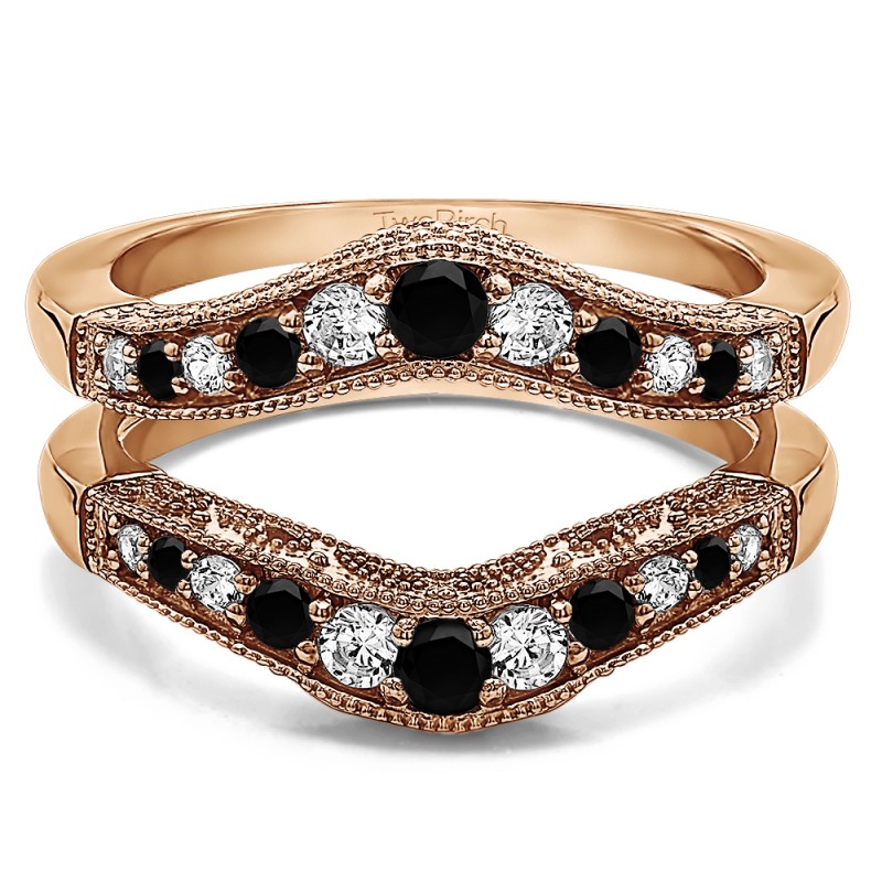 This wedding ring guard has 22 round, channel set stones. Each band measures 2 millimeters wide. This ring guard has 0.75 carats total weight. It is made to fit a round solitaire from 0.5 carats to 2, or a princess or marquise cut solitaire from 0.75 up to 2 carats.