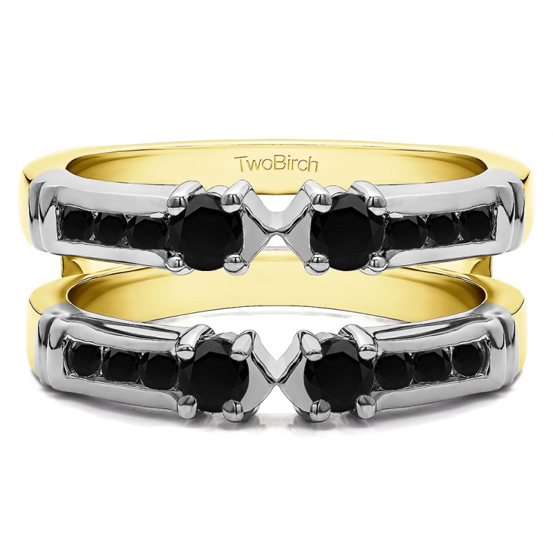 This wedding ring guard has 16 round, channel set stones. Each band measures 2.3 millimeters wide. This ring guard has 0.76 carats total weight. It is made to fit a round or princess cut solitaire from 0.25 carats to 2 carats.