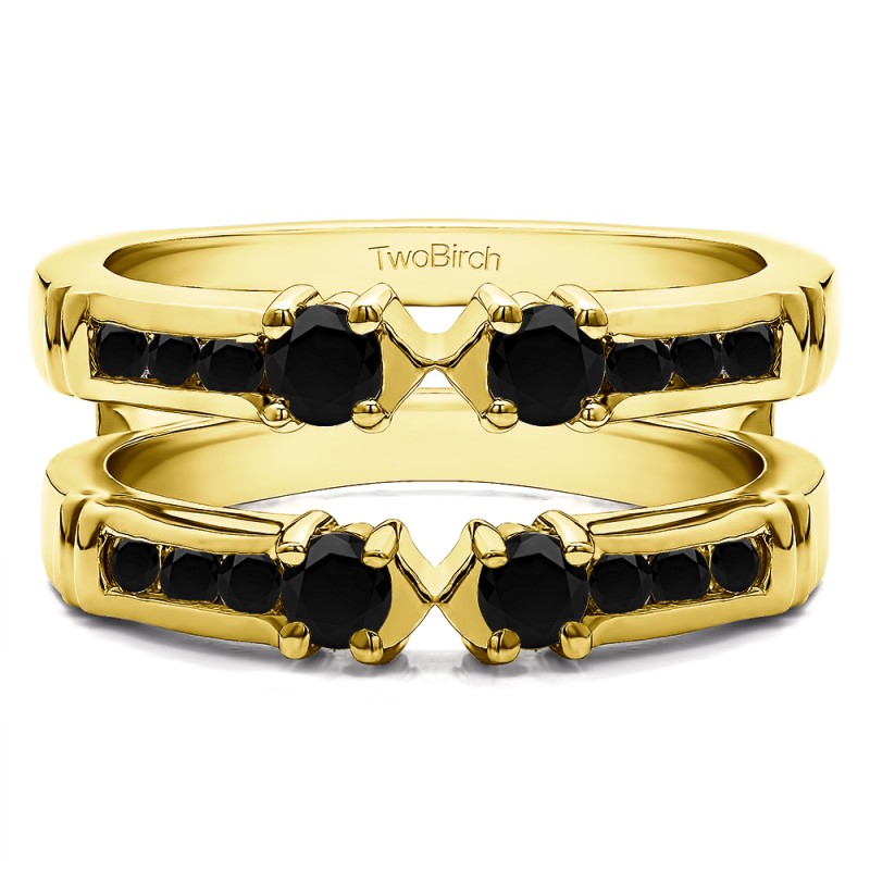 This wedding ring guard has 16 round, channel set stones. Each band measures 2.3 millimeters wide. This ring guard has 0.76 carats total weight. It is made to fit a round or princess cut solitaire from 0.25 carats to 2 carats.