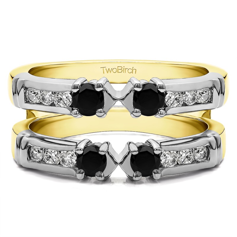 This wedding ring guard has 16 round, channel set stones. Each band measures 2.3 millimeters wide. This ring guard has 0.76 carats total weight. It is made to fit a round or princess cut solitaire from 0.25 carats to 2 carats.