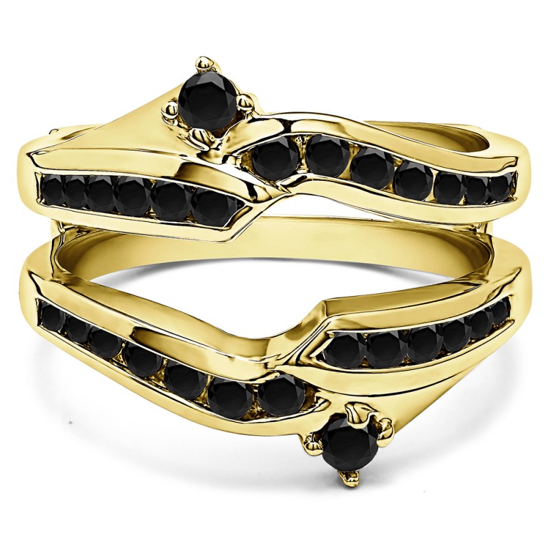 This wedding ring guard has 28 round, channel set stones. Each band measures 2 millimeters wide. This ring guard has 0.79 carats total weight.