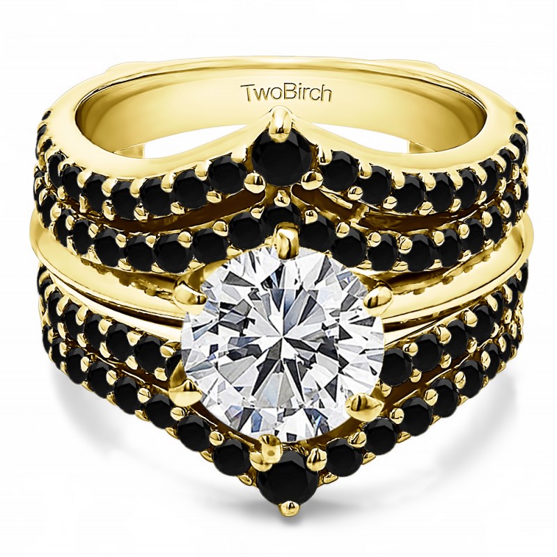 This wedding ring guard has 90 round, prong set stones. Each band measures 2 millimeters wide. This ring guard has 1.52 carats total weight. It is made to fit a round or princess cut solitaire from 0.5 carats to 2 carats.
