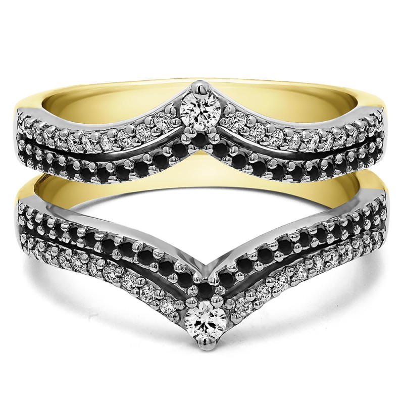 This wedding ring guard has 90 round, prong set stones. Each band measures 2 millimeters wide. This ring guard has 1.52 carats total weight. It is made to fit a round or princess cut solitaire from 0.5 carats to 2 carats.