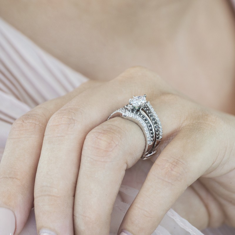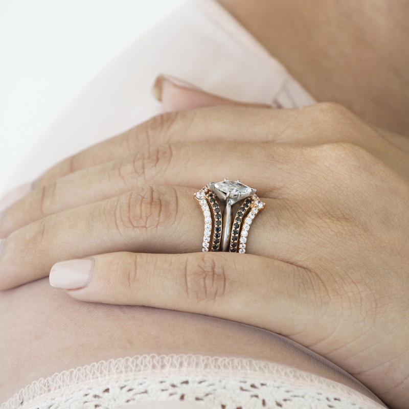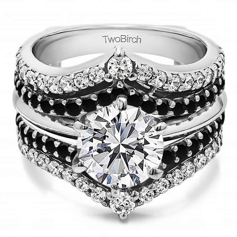 This wedding ring guard has 90 round, prong set stones. Each band measures 2 millimeters wide. This ring guard has 1.52 carats total weight. It is made to fit a round or princess cut solitaire from 0.5 carats to 2 carats.