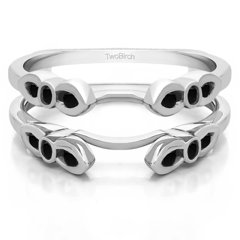 This wedding ring guard has 4 round, prong set stones. Each band measures 1.31 millimeters wide. This ring guard has 0.08 carats total weight. It is made to fit a round solitaire from 0.5 carats to 2, or a princess cut solitaire from 0.5 up to 1, or a marquise solitaire from 0.5 up to 1.5 carats.