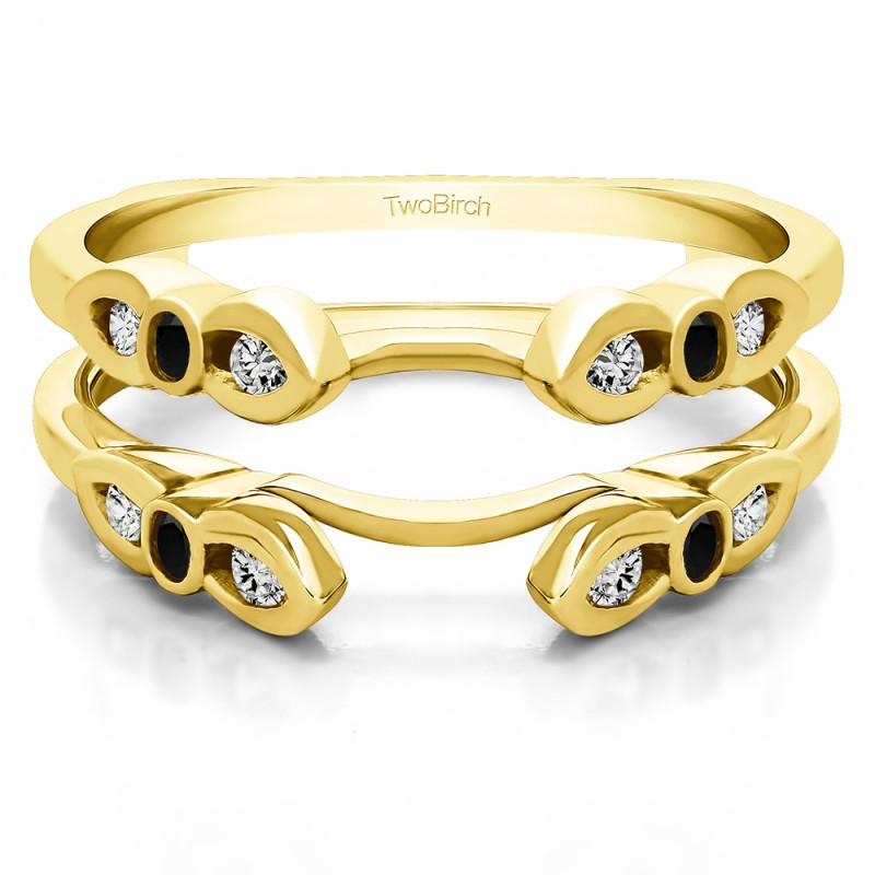 This wedding ring guard has 4 round, prong set stones. Each band measures 1.31 millimeters wide. This ring guard has 0.08 carats total weight. It is made to fit a round solitaire from 0.5 carats to 2, or a princess cut solitaire from 0.5 up to 1, or a marquise solitaire from 0.5 up to 1.5 carats.