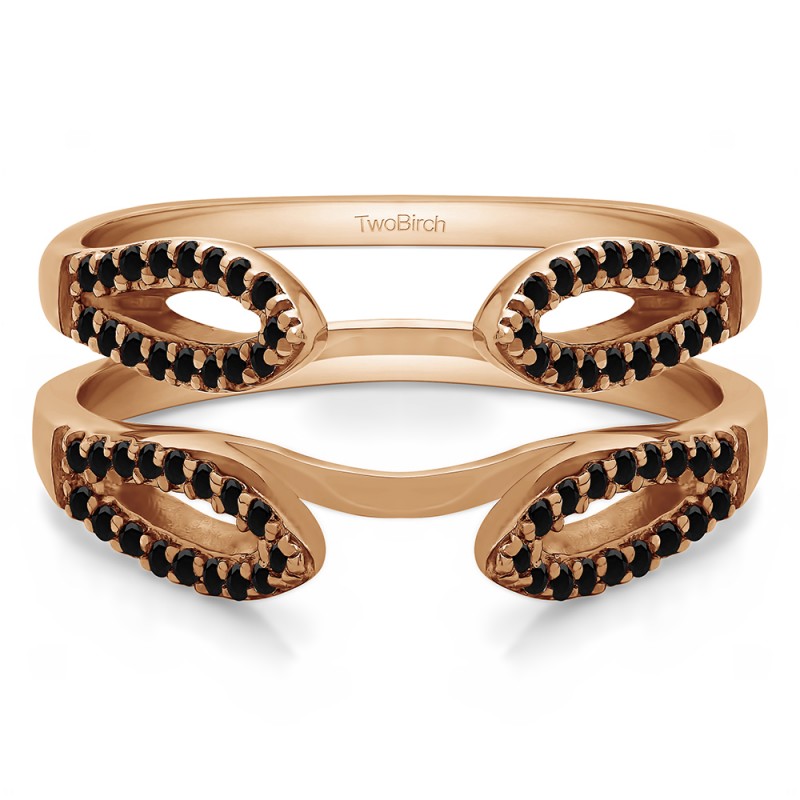 This wedding ring guard has 68 round, prong set stones. Each band measures 1.67 millimeters wide. This ring guard has 0.34 carats total weight. It is made to fit a round solitaire from 0.25 carats to 2, or a princess or marquise cut solitaire from 0.5 up to 1.5 carats.