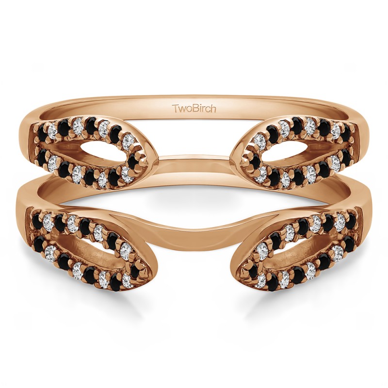 This wedding ring guard has 68 round, prong set stones. Each band measures 1.67 millimeters wide. This ring guard has 0.34 carats total weight. It is made to fit a round solitaire from 0.25 carats to 2, or a princess or marquise cut solitaire from 0.5 up to 1.5 carats.