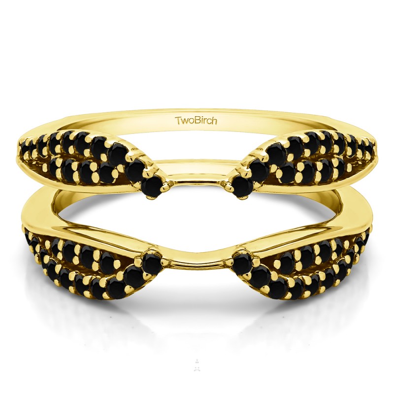 This wedding ring guard has 56 round, prong set stones. Each band measures 1.33 millimeters wide. This ring guard has 0.56 carats total weight. It is made to fit a round solitaire from 0.5 carats to 2, or a princess cut solitaire from 0.5 up to 1, or a marquise solitaire from 0.5 up to 1.5 carats.