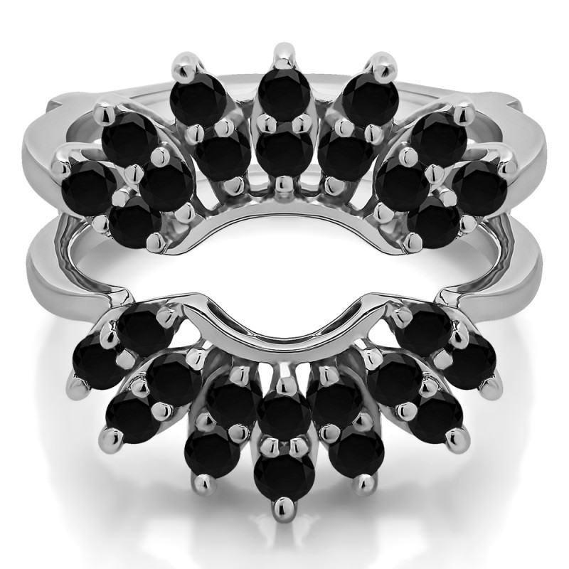 This wedding ring guard has 28 round, prong set stones. Each band measures 1.58 millimeters wide. This ring guard has 0.98 carats total weight. It is made to fit a round solitaire from 0.5 carats to 2, or a princess cut solitaire from 0.5 up to 1.5 carats.