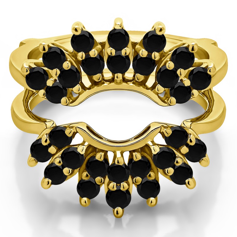 This wedding ring guard has 28 round, prong set stones. Each band measures 1.58 millimeters wide. This ring guard has 0.98 carats total weight. It is made to fit a round solitaire from 0.5 carats to 2, or a princess cut solitaire from 0.5 up to 1.5 carats.
