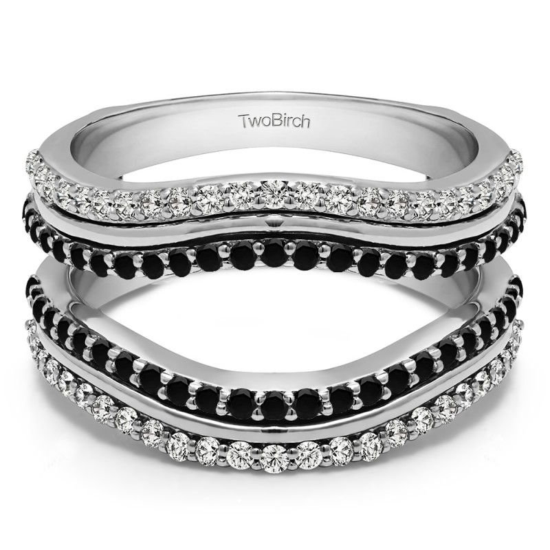 This wedding ring guard has 100 round, prong set stones. Each band measures 2.73 millimeters wide. This ring guard has 0.75 carats total weight. It is made to fit a round or princess cut solitaire from 0.5 carats to 2, or a marquise solitaire from 0.5 up to 1.5 carats.