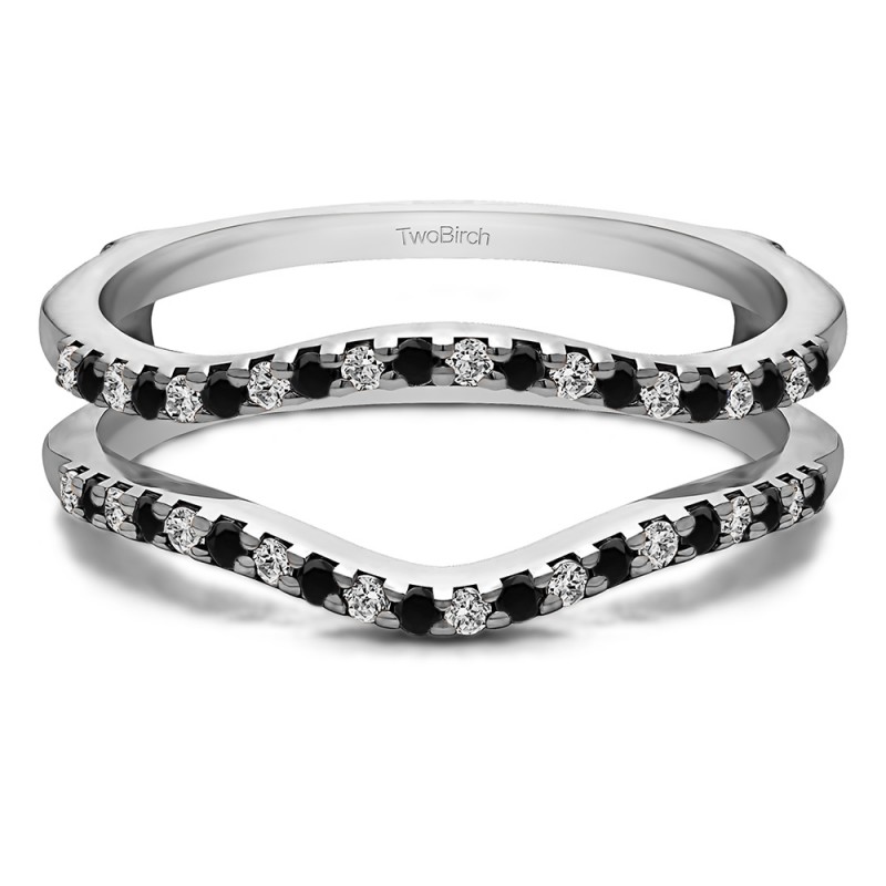 This wedding ring guard has 40 round, prong set stones. Each band measures 1.54 millimeters wide. This ring guard has 0.3 carats total weight. It is made to fit a round solitaire from 0.25 carats to 2, or a princess or marquise cut solitaire from 0.5 up to 1.5 carats.
