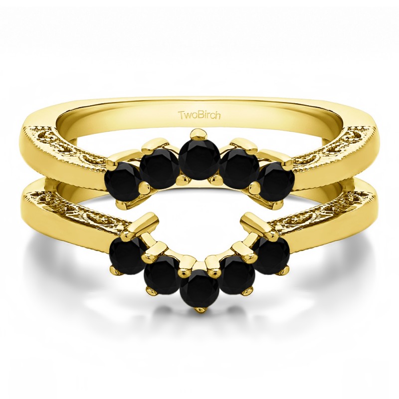 This wedding ring guard has 10 round, prong set stones. Each band measures 1.86 millimeters wide. This ring guard has 0.5 carats total weight. It is made to fit a round solitaire from 0.5 carats to 2, or a princess or marquise cut solitaire from 0.5 up to 1.5 carats.