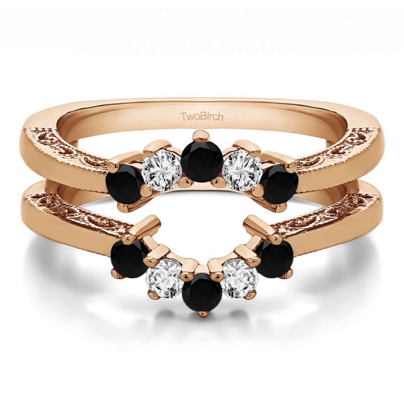 This wedding ring guard has 10 round, prong set stones. Each band measures 1.86 millimeters wide. This ring guard has 0.5 carats total weight. It is made to fit a round solitaire from 0.5 carats to 2, or a princess or marquise cut solitaire from 0.5 up to 1.5 carats.