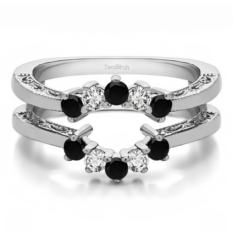 This wedding ring guard has 10 round, prong set stones. Each band measures 1.86 millimeters wide. This ring guard has 0.5 carats total weight. It is made to fit a round solitaire from 0.5 carats to 2, or a princess or marquise cut solitaire from 0.5 up to 1.5 carats.