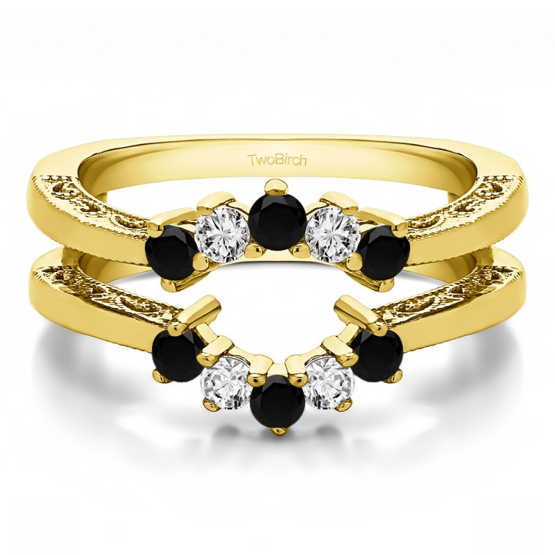 This wedding ring guard has 10 round, prong set stones. Each band measures 1.86 millimeters wide. This ring guard has 0.5 carats total weight. It is made to fit a round solitaire from 0.5 carats to 2, or a princess or marquise cut solitaire from 0.5 up to 1.5 carats.