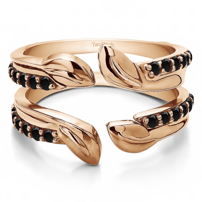 This wedding ring guard has 24 round, prong set stones. Each band measures 2.26 millimeters wide. This ring guard has 0.46 carats total weight. It is made to fit a round solitaire from 0.25 carats to 2, or a princess cut solitaire from 0.5 up to 2, or a marquise solitaire from 0.25 up to 1.5 carats.