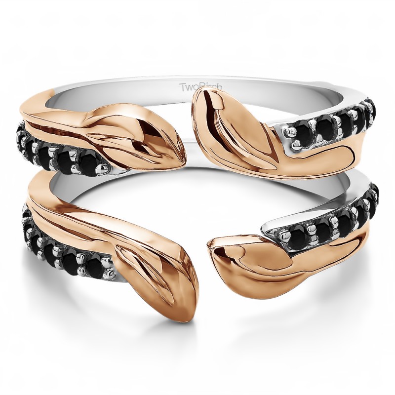 This wedding ring guard has 24 round, prong set stones. Each band measures 2.26 millimeters wide. This ring guard has 0.46 carats total weight. It is made to fit a round solitaire from 0.25 carats to 2, or a princess cut solitaire from 0.5 up to 2, or a marquise solitaire from 0.25 up to 1.5 carats.