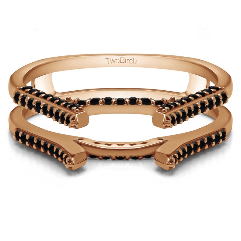 This wedding ring guard has 82 round, prong set stones. Each band measures 1.33 millimeters wide. This ring guard has 0.42 carats total weight. It is made to fit a round solitaire from 0.5 carats to 2, or a princess or marquise cut solitaire from 0.5 up to 1.5 carats.