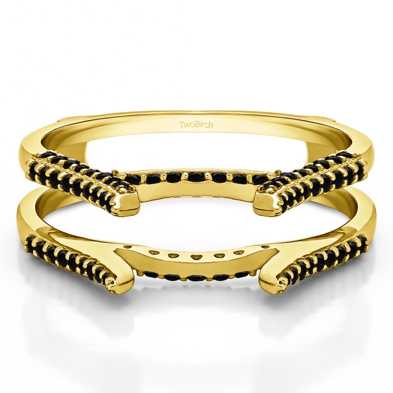 This wedding ring guard has 82 round, prong set stones. Each band measures 1.33 millimeters wide. This ring guard has 0.42 carats total weight. It is made to fit a round solitaire from 0.5 carats to 2, or a princess or marquise cut solitaire from 0.5 up to 1.5 carats.