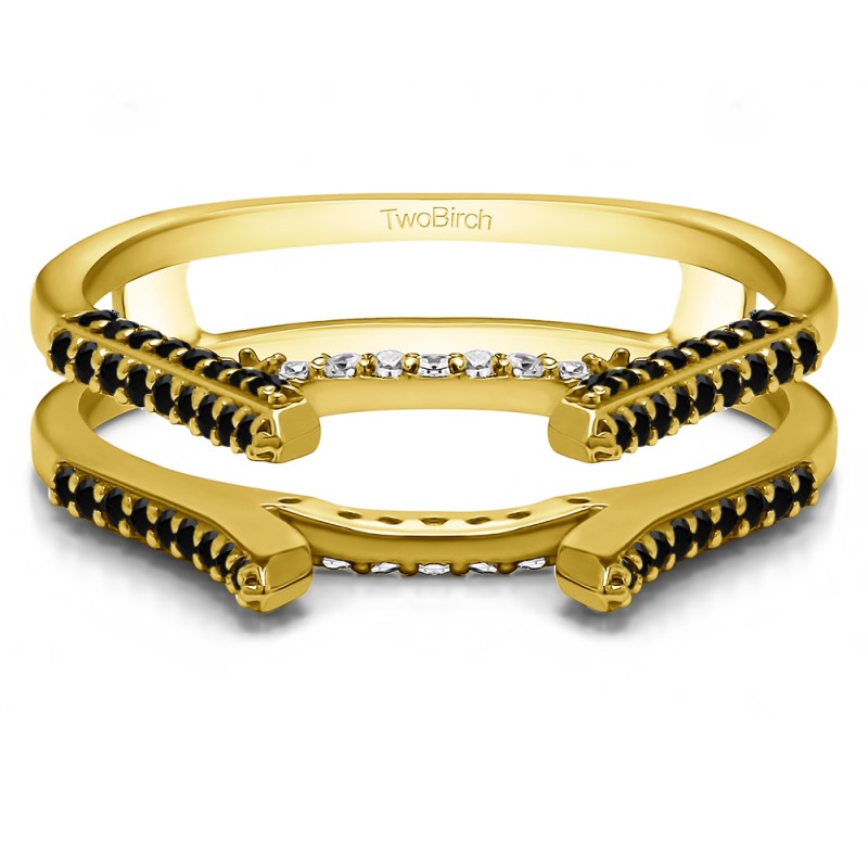 This wedding ring guard has 82 round, prong set stones. Each band measures 1.33 millimeters wide. This ring guard has 0.42 carats total weight. It is made to fit a round solitaire from 0.5 carats to 2, or a princess or marquise cut solitaire from 0.5 up to 1.5 carats.