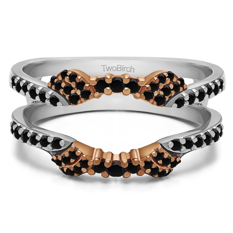 This wedding ring guard has 62 round, prong set stones. Each band measures 1.85 millimeters wide. This ring guard has 0.47 carats total weight. It is made to fit a round solitaire from 0.5 carats to 2, or a princess cut solitaire from 0.25 up to 1.5, or a marquise solitaire from 0.5 up to 1.5 carats.