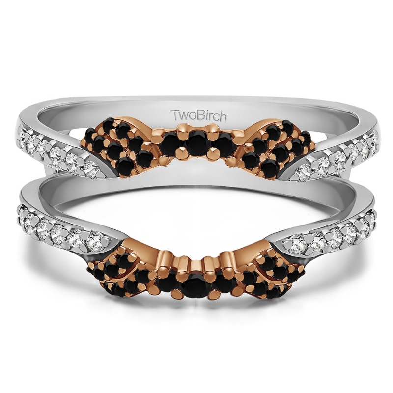 This wedding ring guard has 62 round, prong set stones. Each band measures 1.85 millimeters wide. This ring guard has 0.47 carats total weight. It is made to fit a round solitaire from 0.5 carats to 2, or a princess cut solitaire from 0.25 up to 1.5, or a marquise solitaire from 0.5 up to 1.5 carats.